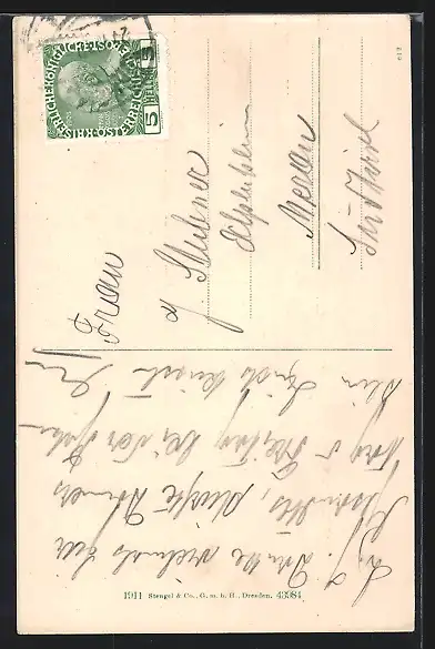 Personenbezogene Daten auf der Rückseite der Karte wurden durch blauen Textmarker unkenntlich gemacht. Die blauen Stellen sind auf die Vorderseite durchgeweicht und wirken sich negativ auf das Postkartenfoto aus