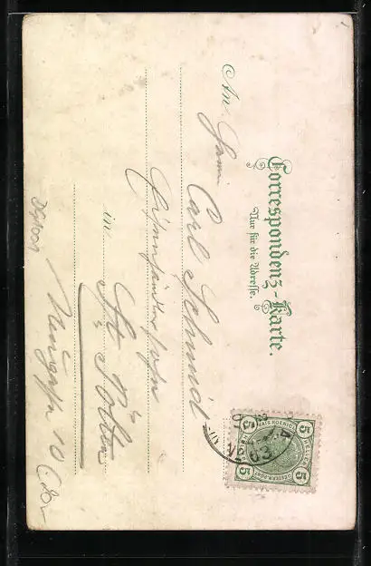 Personenbezogene Daten auf der Rückseite der Karte wurden durch blauen Textmarker unkenntlich gemacht. Die blauen Stellen sind auf die Vorderseite durchgeweicht und wirken sich negativ auf das Postkartenfoto aus