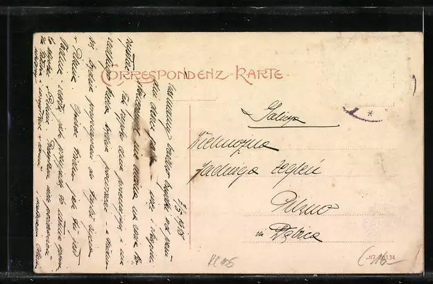 Personenbezogene Daten auf der Rückseite der Karte wurden durch blauen Textmarker unkenntlich gemacht. Die blauen Stellen sind auf die Vorderseite durchgeweicht und wirken sich negativ auf das Postkartenfoto aus