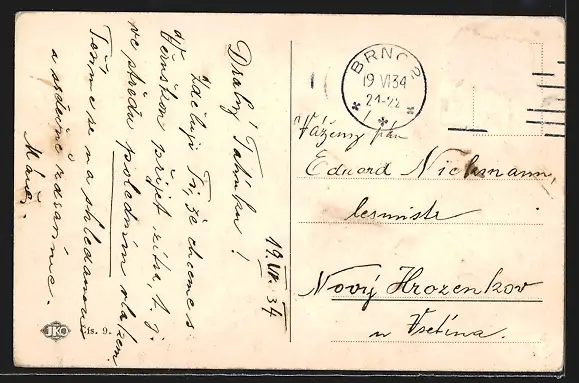 gelaufen 1934, Briefmarke entfernt, rückseitig Oberflächenschaden, Abriebspur oben li., guter Zustand