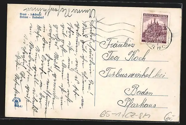 Personenbezogene Daten auf der Rückseite der Karte wurden durch blauen Textmarker unkenntlich gemacht. Die blauen Stellen sind auf die Vorderseite durchgeweicht und wirken sich negativ auf das Postkartenfoto aus
