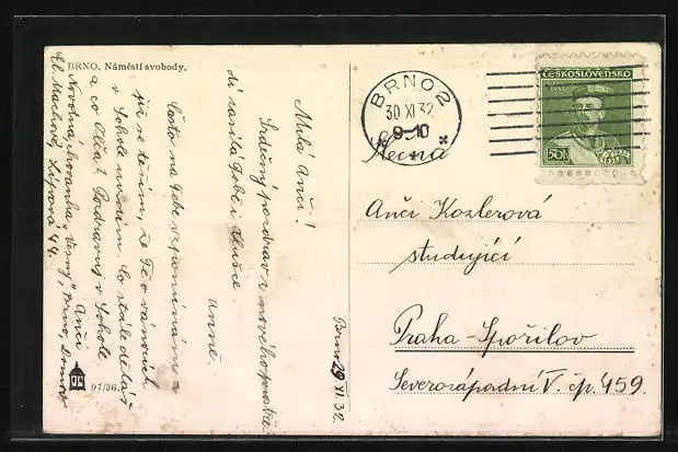 Personenbezogene Daten auf der Rückseite der Karte wurden durch blauen Textmarker unkenntlich gemacht. Die blauen Stellen sind auf die Vorderseite durchgeweicht und wirken sich negativ auf das Postkartenfoto aus