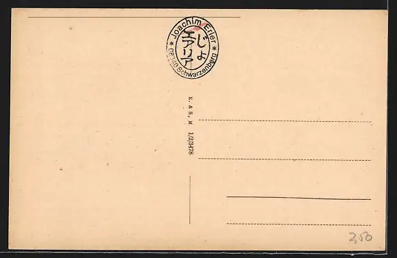 Personenbezogene Daten auf der Rückseite der Karte wurden durch blauen Textmarker unkenntlich gemacht. Die blauen Stellen sind auf die Vorderseite durchgeweicht und wirken sich negativ auf das Postkartenfoto aus