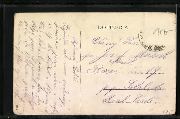 Personenbezogene Daten auf der Rückseite der Karte wurden durch blauen Textmarker unkenntlich gemacht. Die blauen Stellen sind auf die Vorderseite durchgeweicht und wirken sich negativ auf das Postkartenfoto aus