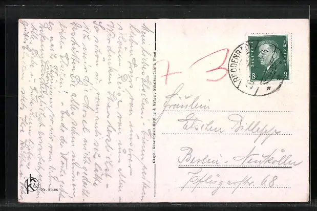Personenbezogene Daten auf der Rückseite der Karte wurden durch blauen Textmarker unkenntlich gemacht. Die blauen Stellen sind auf die Vorderseite durchgeweicht und wirken sich negativ auf das Postkartenfoto aus