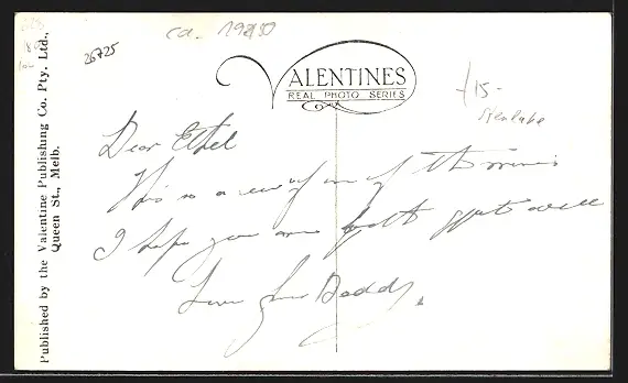 Personenbezogene Daten auf der Rückseite der Karte wurden durch blauen Textmarker unkenntlich gemacht. Die blauen Stellen sind auf die Vorderseite durchgeweicht und wirken sich negativ auf das Postkartenfoto aus
