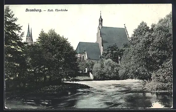 AK Bromberg, Uferpartie an der Kath. Pfarrkirche