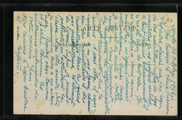 Personenbezogene Daten auf der Rückseite der Karte wurden durch blauen Textmarker unkenntlich gemacht. Die blauen Stellen sind auf die Vorderseite durchgeweicht und wirken sich negativ auf das Postkartenfoto aus