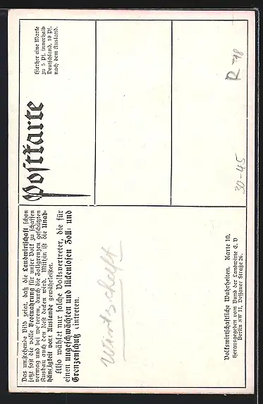 Personenbezogene Daten auf der Rückseite der Karte wurden durch blauen Textmarker unkenntlich gemacht. Die blauen Stellen sind auf die Vorderseite durchgeweicht und wirken sich negativ auf das Postkartenfoto aus