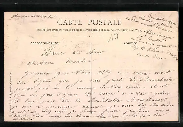 Personenbezogene Daten auf der Rückseite der Karte wurden durch blauen Textmarker unkenntlich gemacht. Die blauen Stellen sind auf die Vorderseite durchgeweicht und wirken sich negativ auf das Postkartenfoto aus