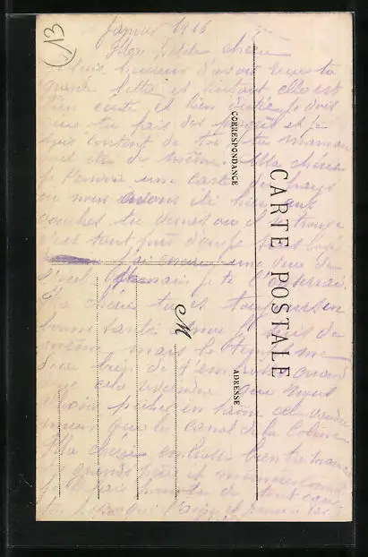 Personenbezogene Daten auf der Rückseite der Karte wurden durch blauen Textmarker unkenntlich gemacht. Die blauen Stellen sind auf die Vorderseite durchgeweicht und wirken sich negativ auf das Postkartenfoto aus