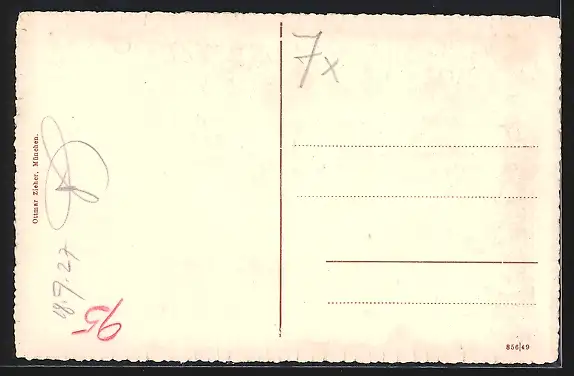 Personenbezogene Daten auf der Rückseite der Karte wurden durch blauen Textmarker unkenntlich gemacht. Die blauen Stellen sind auf die Vorderseite durchgeweicht und wirken sich negativ auf das Postkartenfoto aus