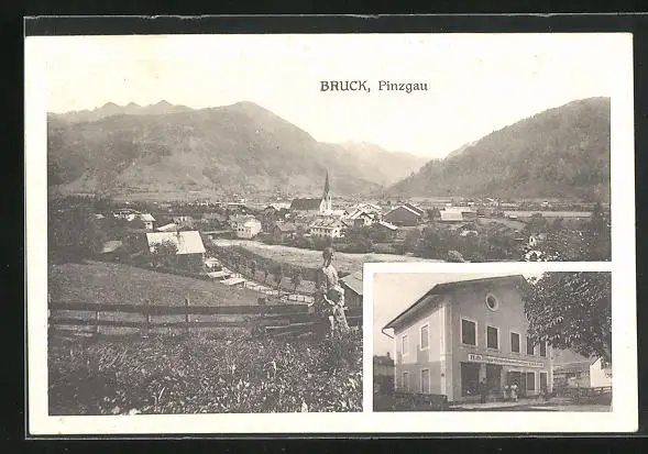AK Bruck /Pinzgau, Höger Gemischtwarenhandlung, Ortsansicht mit Bergen