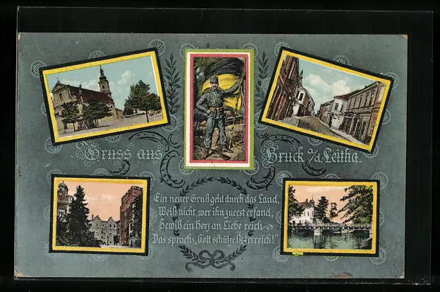 AK Bruck a. d. Leitha, Kirche, Strassenpartie, Österreichischer Soldat in Uniform mit Fahne