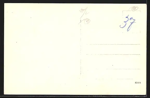 Personenbezogene Daten auf der Rückseite der Karte wurden durch blauen Textmarker unkenntlich gemacht. Die blauen Stellen sind auf die Vorderseite durchgeweicht und wirken sich negativ auf das Postkartenfoto aus