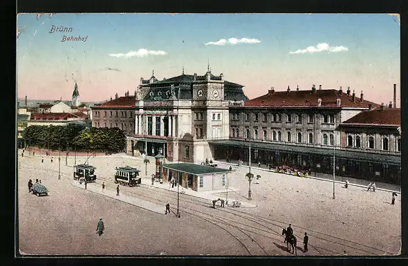AK Brünn-Brno, Bahnhof mit Strassenbahnen