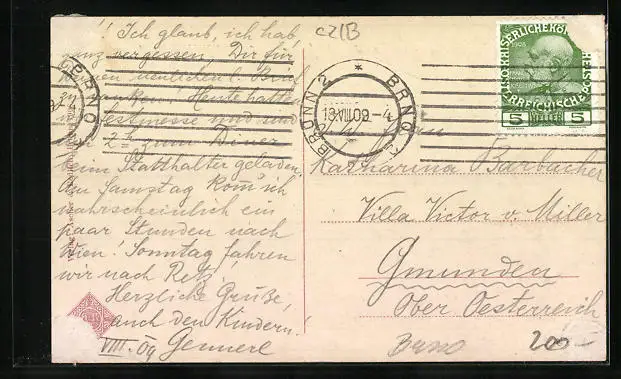gelaufen 1909, Eckknick oben li. und unten re., guter Zustand