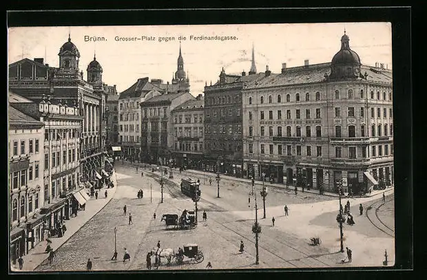 AK Brünn, Grosser Platz mit Strassenbahn