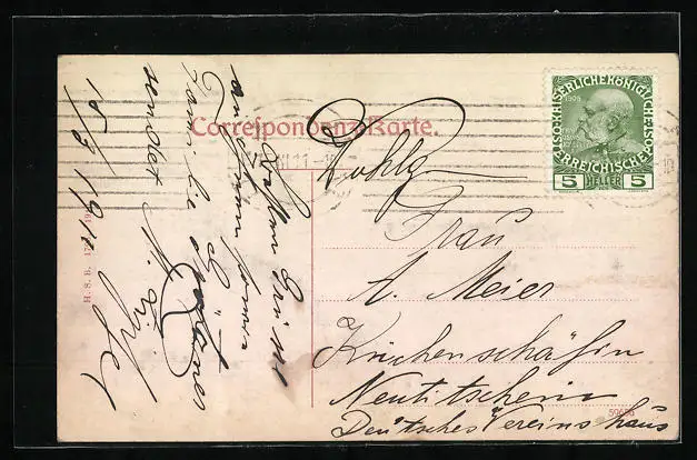 Personenbezogene Daten auf der Rückseite der Karte wurden durch blauen Textmarker unkenntlich gemacht. Die blauen Stellen sind auf die Vorderseite durchgeweicht und wirken sich negativ auf das Postkartenfoto aus