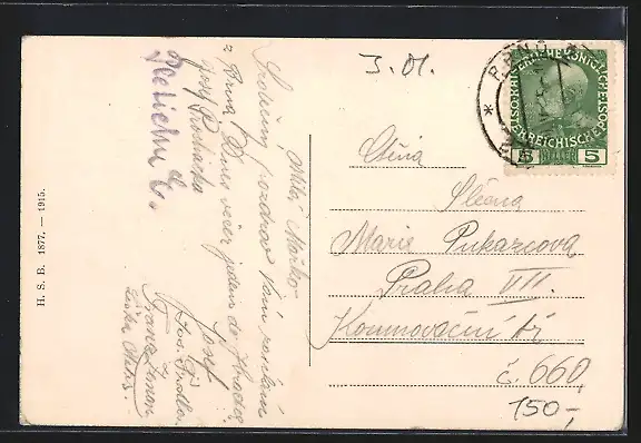 Personenbezogene Daten auf der Rückseite der Karte wurden durch blauen Textmarker unkenntlich gemacht. Die blauen Stellen sind auf die Vorderseite durchgeweicht und wirken sich negativ auf das Postkartenfoto aus
