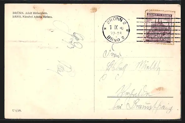 Personenbezogene Daten auf der Rückseite der Karte wurden durch blauen Textmarker unkenntlich gemacht. Die blauen Stellen sind auf die Vorderseite durchgeweicht und wirken sich negativ auf das Postkartenfoto aus