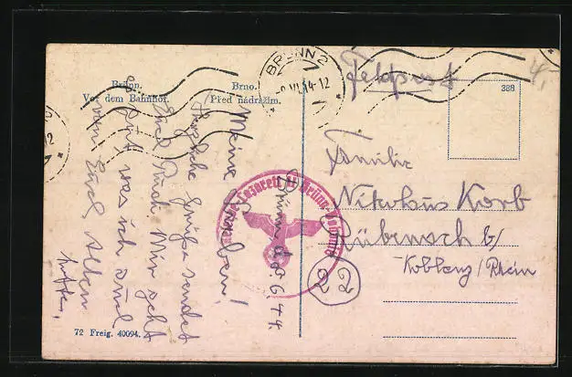 Personenbezogene Daten auf der Rückseite der Karte wurden durch blauen Textmarker unkenntlich gemacht. Die blauen Stellen sind auf die Vorderseite durchgeweicht und wirken sich negativ auf das Postkartenfoto aus