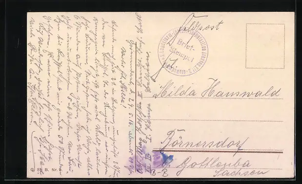 Personenbezogene Daten auf der Rückseite der Karte wurden durch blauen Textmarker unkenntlich gemacht. Die blauen Stellen sind auf die Vorderseite durchgeweicht und wirken sich negativ auf das Postkartenfoto aus