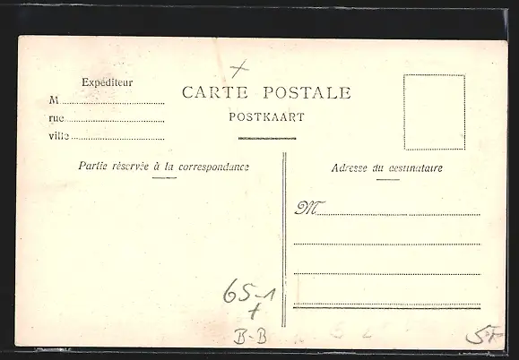 Personenbezogene Daten auf der Rückseite der Karte wurden durch blauen Textmarker unkenntlich gemacht. Die blauen Stellen sind auf die Vorderseite durchgeweicht und wirken sich negativ auf das Postkartenfoto aus