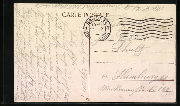 Personenbezogene Daten auf der Rückseite der Karte wurden durch blauen Textmarker unkenntlich gemacht. Die blauen Stellen sind auf die Vorderseite durchgeweicht und wirken sich negativ auf das Postkartenfoto aus