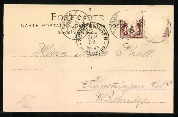 alte Ansichtskarte, gelaufen 1898, Briefmarke tw. entfernt, rückseitig Oberflächenschaden, Bugspur li. oben, guter Zustand