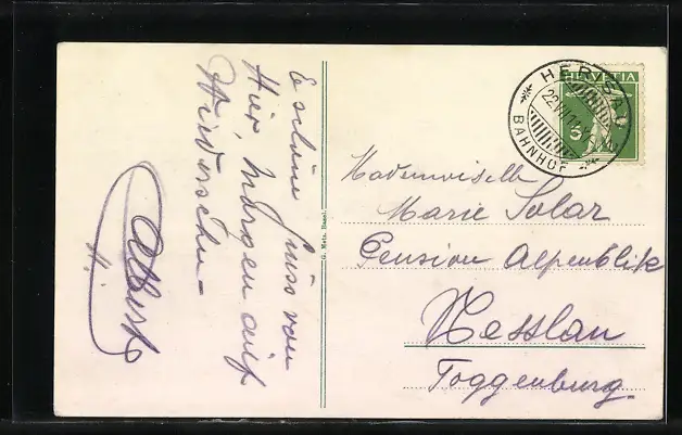Personenbezogene Daten auf der Rückseite der Karte wurden durch blauen Textmarker unkenntlich gemacht. Die blauen Stellen sind auf die Vorderseite durchgeweicht und wirken sich negativ auf das Postkartenfoto aus