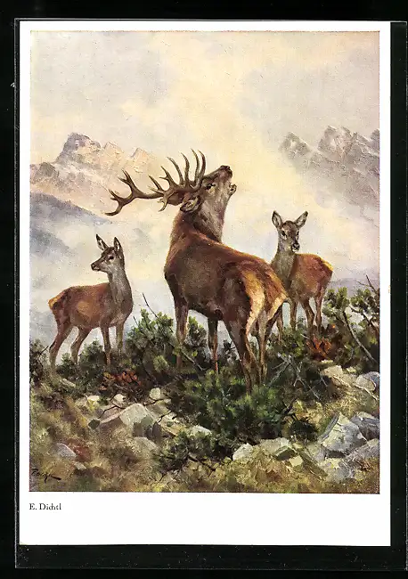 AK Brunftzeit, röhrender Hirsch & Rehe