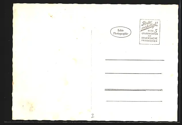 Personenbezogene Daten auf der Rückseite der Karte wurden durch blauen Textmarker unkenntlich gemacht. Die blauen Stellen sind auf die Vorderseite durchgeweicht und wirken sich negativ auf das Postkartenfoto aus