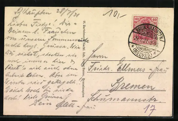 Personenbezogene Daten auf der Rückseite der Karte wurden durch blauen Textmarker unkenntlich gemacht. Die blauen Stellen sind auf die Vorderseite durchgeweicht und wirken sich negativ auf das Postkartenfoto aus