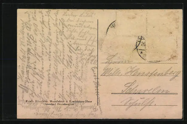 Personenbezogene Daten auf der Rückseite der Karte wurden durch blauen Textmarker unkenntlich gemacht. Die blauen Stellen sind auf die Vorderseite durchgeweicht und wirken sich negativ auf das Postkartenfoto aus