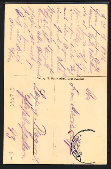 Personenbezogene Daten auf der Rückseite der Karte wurden durch blauen Textmarker unkenntlich gemacht. Die blauen Stellen sind auf die Vorderseite durchgeweicht und wirken sich negativ auf das Postkartenfoto aus