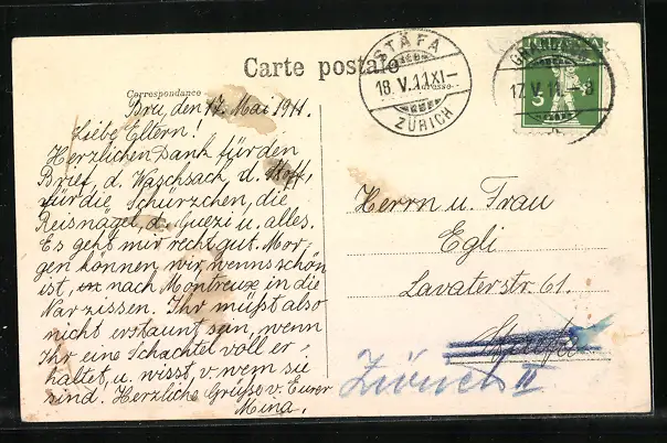 Personenbezogene Daten auf der Rückseite der Karte wurden durch blauen Textmarker unkenntlich gemacht. Die blauen Stellen sind auf die Vorderseite durchgeweicht und wirken sich negativ auf das Postkartenfoto aus