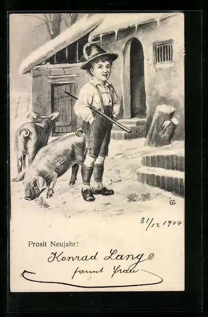 AK Bub in Lederhosen und zwei Schweine, Neujahrsgruss