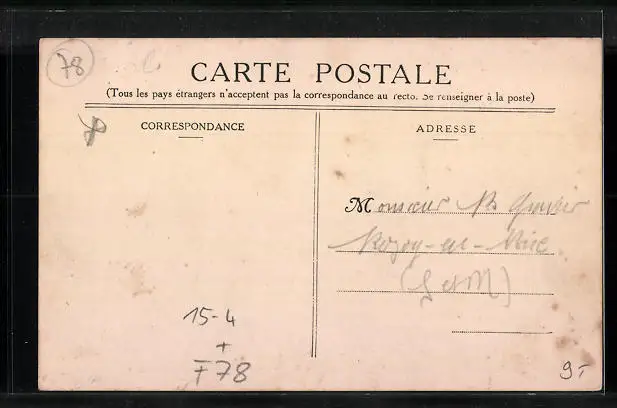 Personenbezogene Daten auf der Rückseite der Karte wurden durch blauen Textmarker unkenntlich gemacht. Die blauen Stellen sind auf die Vorderseite durchgeweicht und wirken sich negativ auf das Postkartenfoto aus