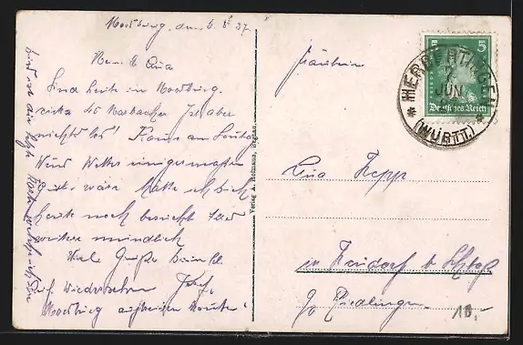 Personenbezogene Daten auf der Rückseite der Karte wurden durch blauen Textmarker unkenntlich gemacht. Die blauen Stellen sind auf die Vorderseite durchgeweicht und wirken sich negativ auf das Postkartenfoto aus