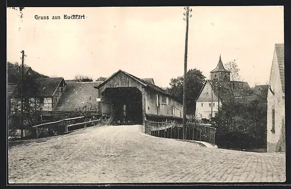 AK Buchfart, Ortspartie an einer alten überdachten Brücke