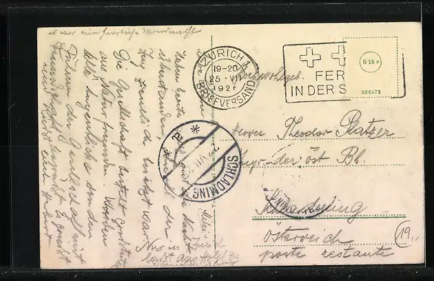Personenbezogene Daten auf der Rückseite der Karte wurden durch blauen Textmarker unkenntlich gemacht. Die blauen Stellen sind auf die Vorderseite durchgeweicht und wirken sich negativ auf das Postkartenfoto aus