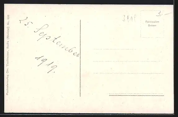 Personenbezogene Daten auf der Rückseite der Karte wurden durch blauen Textmarker unkenntlich gemacht. Die blauen Stellen sind auf die Vorderseite durchgeweicht und wirken sich negativ auf das Postkartenfoto aus
