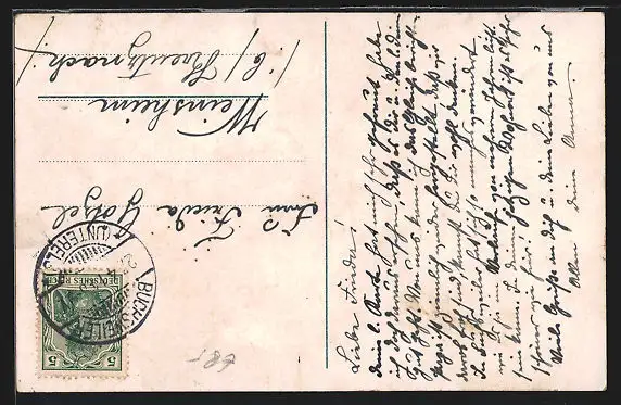 Personenbezogene Daten auf der Rückseite der Karte wurden durch blauen Textmarker unkenntlich gemacht. Die blauen Stellen sind auf die Vorderseite durchgeweicht und wirken sich negativ auf das Postkartenfoto aus
