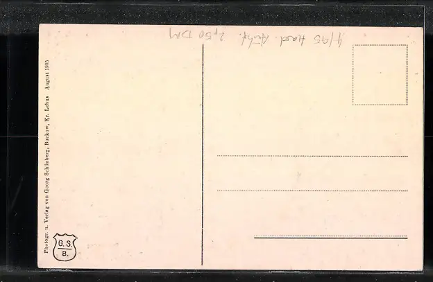 Personenbezogene Daten auf der Rückseite der Karte wurden durch blauen Textmarker unkenntlich gemacht. Die blauen Stellen sind auf die Vorderseite durchgeweicht und wirken sich negativ auf das Postkartenfoto aus