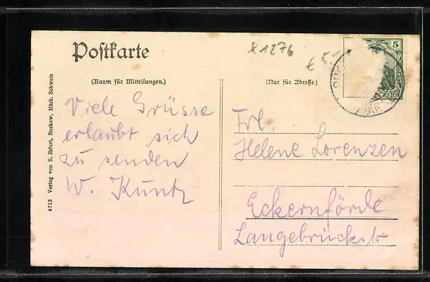 Personenbezogene Daten auf der Rückseite der Karte wurden durch blauen Textmarker unkenntlich gemacht. Die blauen Stellen sind auf die Vorderseite durchgeweicht und wirken sich negativ auf das Postkartenfoto aus
