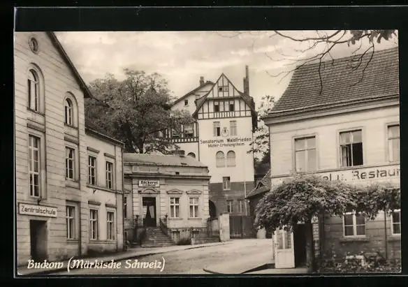 AK Buckow /Märk. Schweiz, Zentralschule mit Hotel u. Sanatorium Waldfrieden