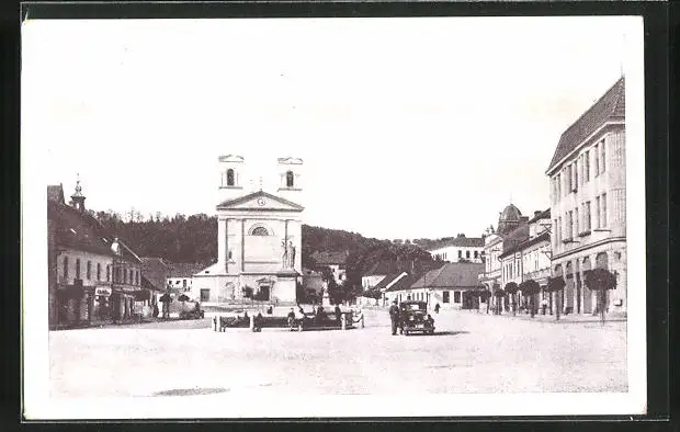 AK Bucovice, Frühes Automobil am Mariendenkmal vor Kirche