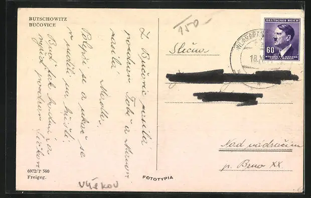 Personenbezogene Daten auf der Rückseite der Karte wurden durch blauen Textmarker unkenntlich gemacht. Die blauen Stellen sind auf die Vorderseite durchgeweicht und wirken sich negativ auf das Postkartenfoto aus