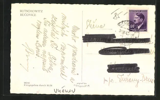 Personenbezogene Daten auf der Rückseite der Karte wurden durch blauen Textmarker unkenntlich gemacht. Die blauen Stellen sind auf die Vorderseite durchgeweicht und wirken sich negativ auf das Postkartenfoto aus